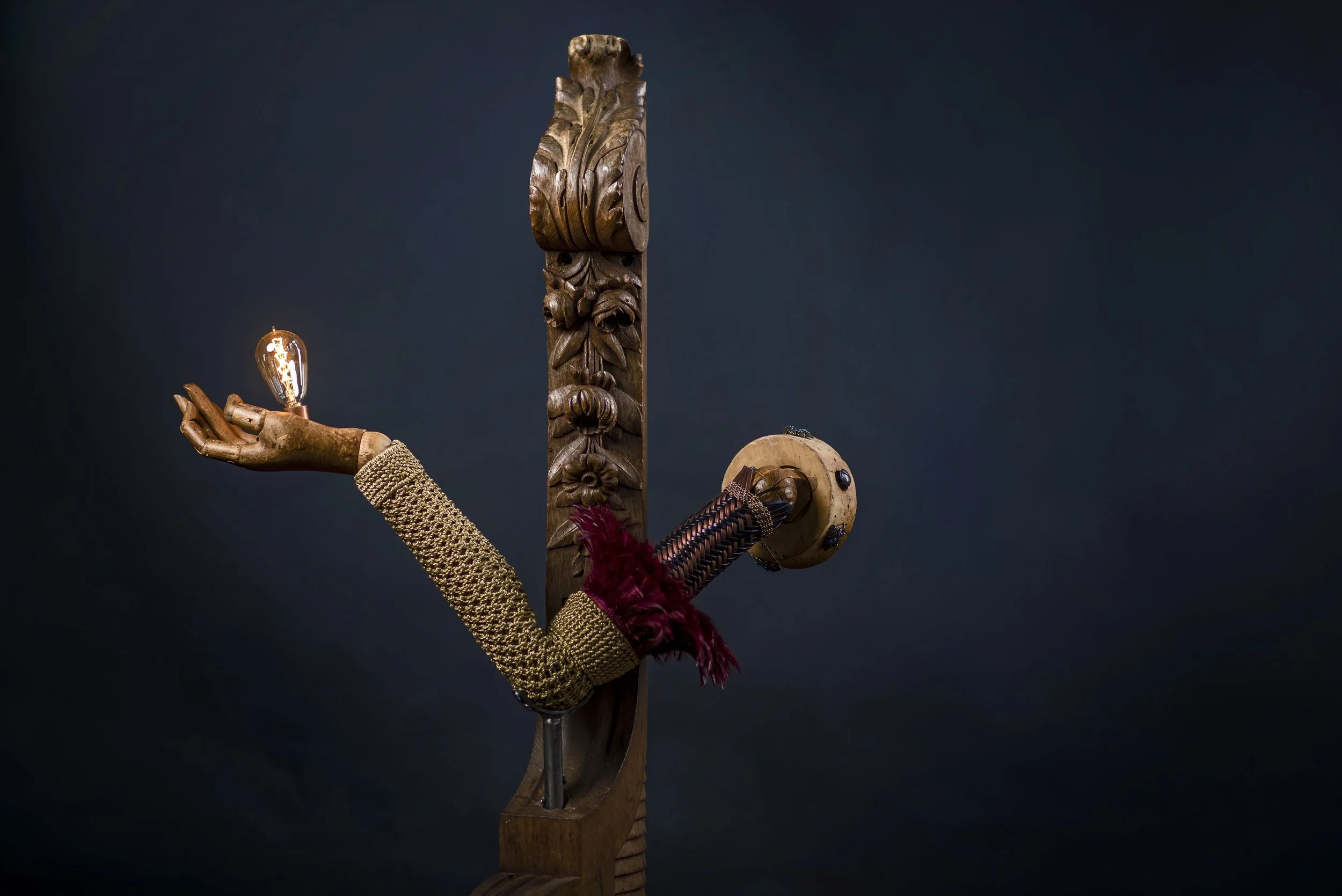 Antique French mannequin arm, knotted gold metallic cord, French rooster feathers, antique bannister, Edison bulb illumination